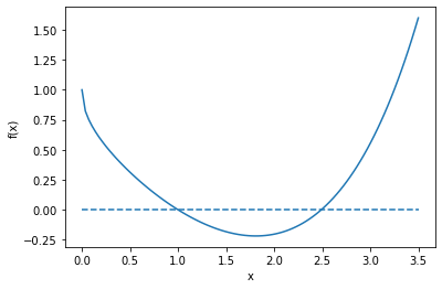 We see that our function has two zeros, one near x^*\simeq 1 and another one near x^∗ \simeq 2.5. We can check that x^*=1 is indeed a root.